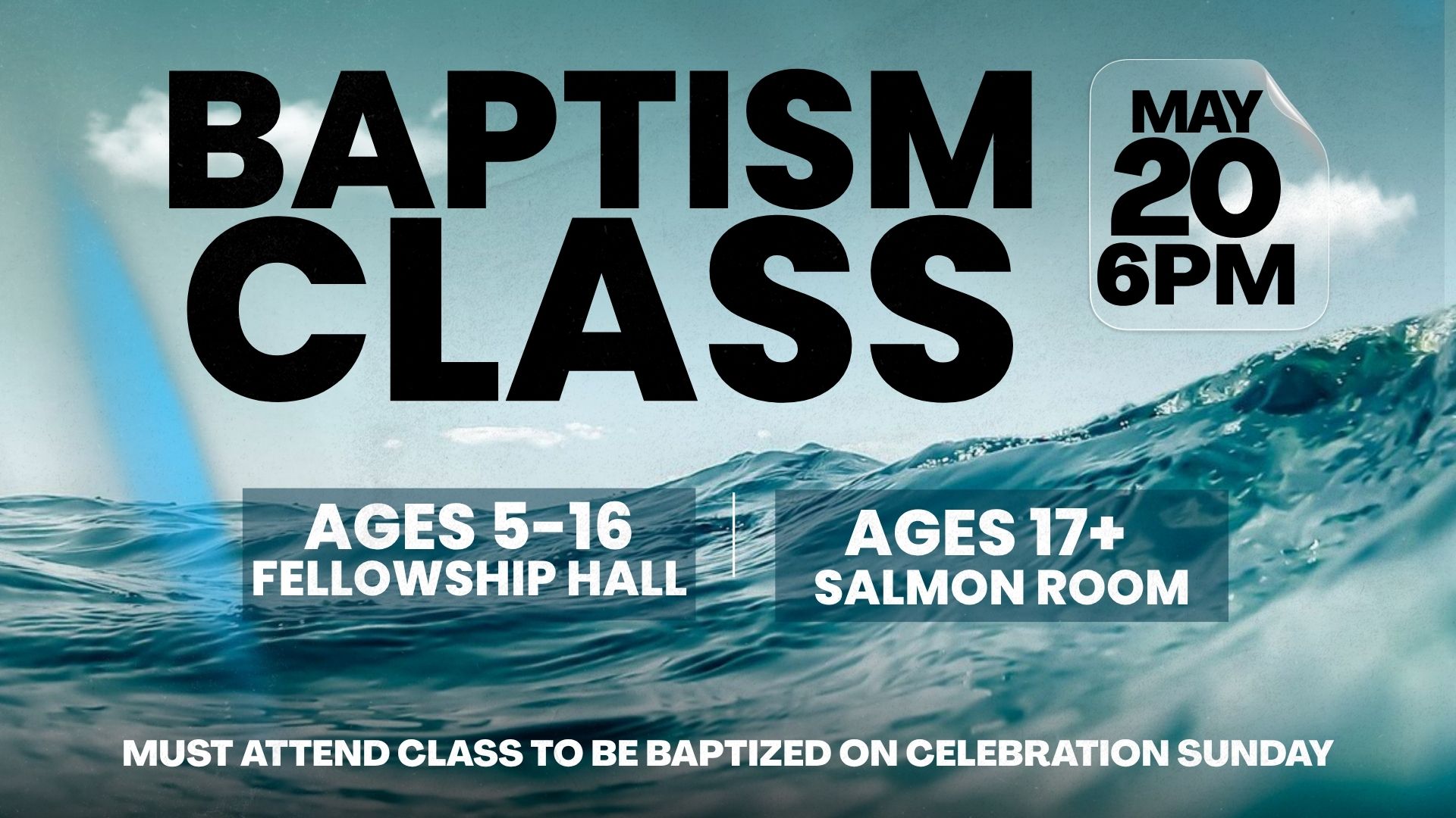 Wednesday, May 20th, 2026 - Seeds Baptism Class. Two classes, one in the Salmon Room (Ages 17+) and one in the Fellowship Hall (Ages 5 - 16). Class starts at 6:00 p.m. Must attend class to be baptized on Celebration Sunday. Registration details will be announced next week.