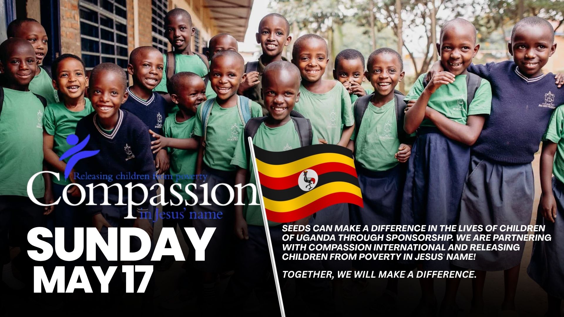 Sunday, May 17th, 2026 Compassion Sunday, join us to learn how families from Seeds can make a difference in the lives of [number of children is needed] children of Uganda through sponsorship. We are partnering with Compassion International and releasing children from poverty in Jesus' name! Together, we WILL make a difference.